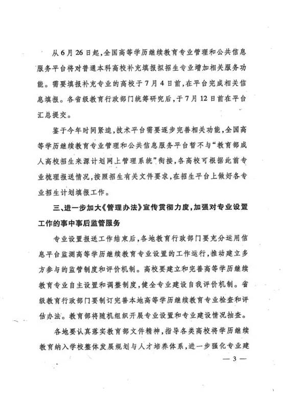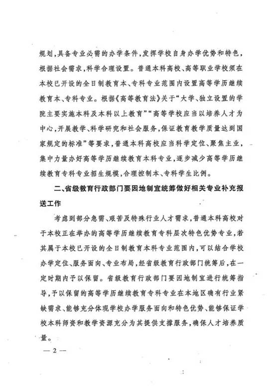 通知指出:普通本科高校应当科学定位、聚焦主业,集中力量办好高等学历继续教育本科专业,逐步减少高等学历继续教育专科专业招生规模,合理控制本、专科学生比例。
