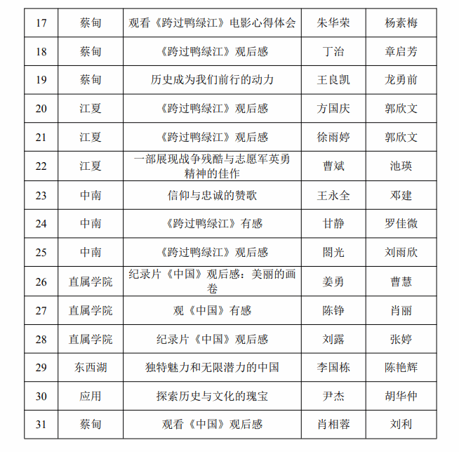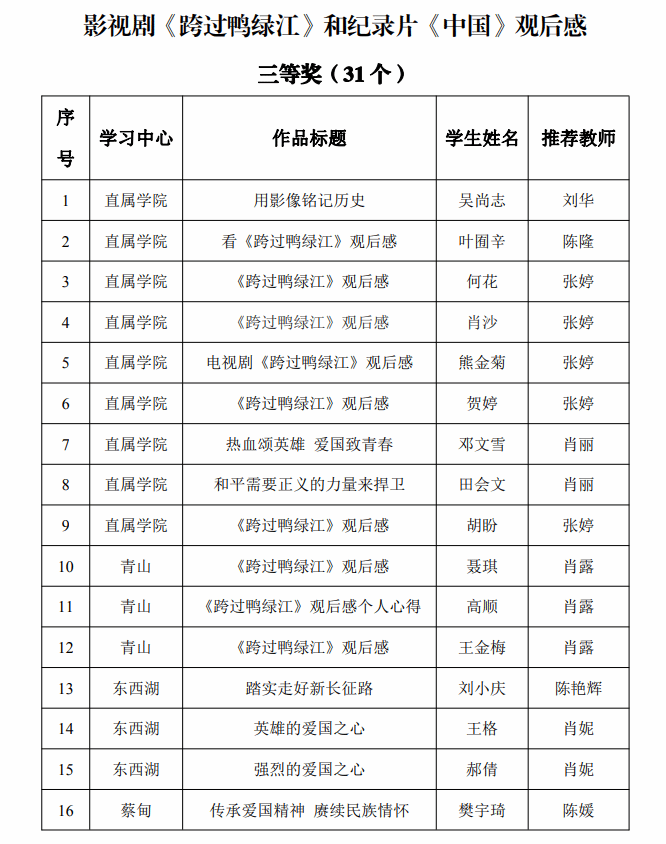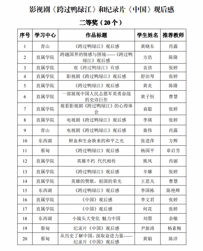 为深入学习贯彻党的二十大精神和习近平总书记关于教育的重要论述,巩固拓展学习贯彻习近平新时代中国特色社会主义思想主题教育成果,传承革命精神,弘扬民族文化,厚植爱国情怀,凝聚奋斗力量,砥砺强国之志,根据国家开放大学《关于组织观看影视剧《跨过鸭绿江》和纪录片《中国》并撰写观后感的通知》(国开学生函〔2023〕9 号)文件,我校组织学生观看影视剧《跨过鸭绿江》和纪录片《中国》,并举办观后感征文评选活动。