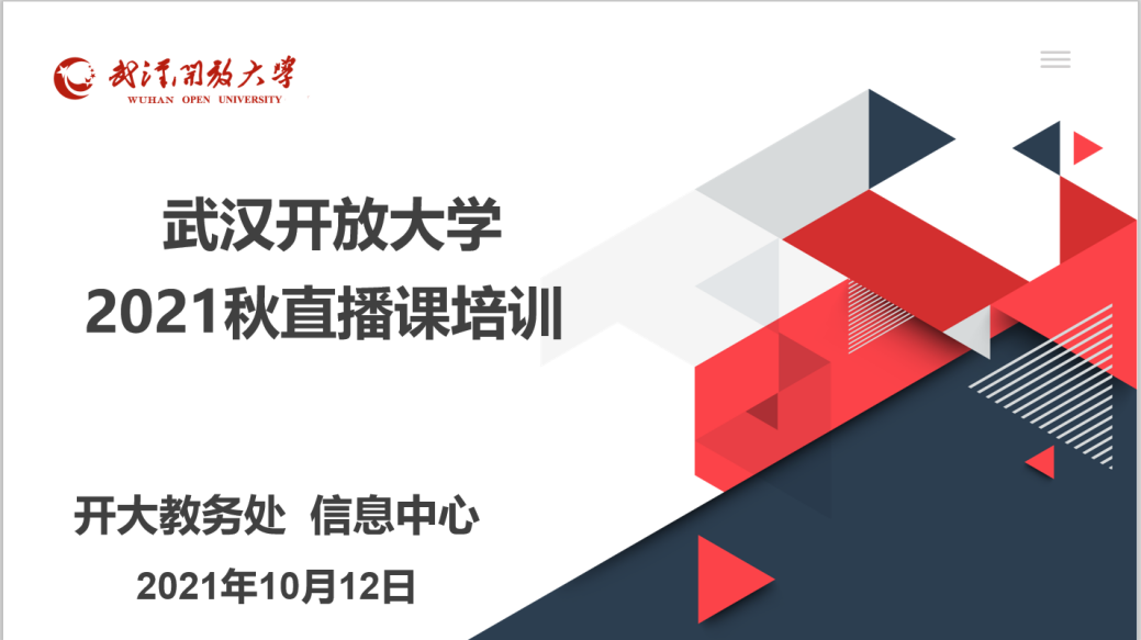 为了落实全国开放大学的创新体制战略,将全市优质课程资源向全市分享,10月12日下午,武汉开放大学教务处利用腾讯会议组织开展了2021秋开放教育直播课责任教师的线上培训会。教务处处长邹莉、教学管理科副科长赵绍普、信息中心徐焱和黄晋老师以及各位课程责任教师全程参与了此次培训会。