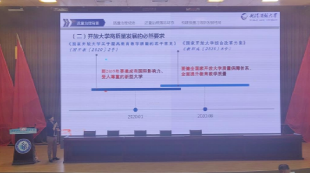会议伊始,开大教务处副处长罗炜立足教学管理过程,对《国家开放大学开放教育教学过程管理规范(试行)》文件进行解读,重点强调了教学准备、教学组织与实施过程中全体教师需要关注的内容。她指出,要严格遵循开放教育教学的具体要求,将教学过程落到实处。