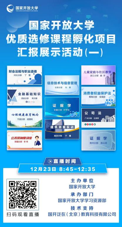 为深入贯彻《数智赋能一体化协同推进开放大学教育教学综合改革实施意见》,进一步提升省开课资源建设质量,推动优质资源共享应用,根据《关于公布国家开放大学第一批选修课程立项孵化名单的通知》要求,国家开放大学将举办优质选修课程孵化项目第一期汇报展示活动,由来自国家开放大学11个分部的课程负责人围绕课程资源建设情况与特色亮点开展分享。