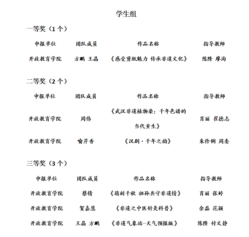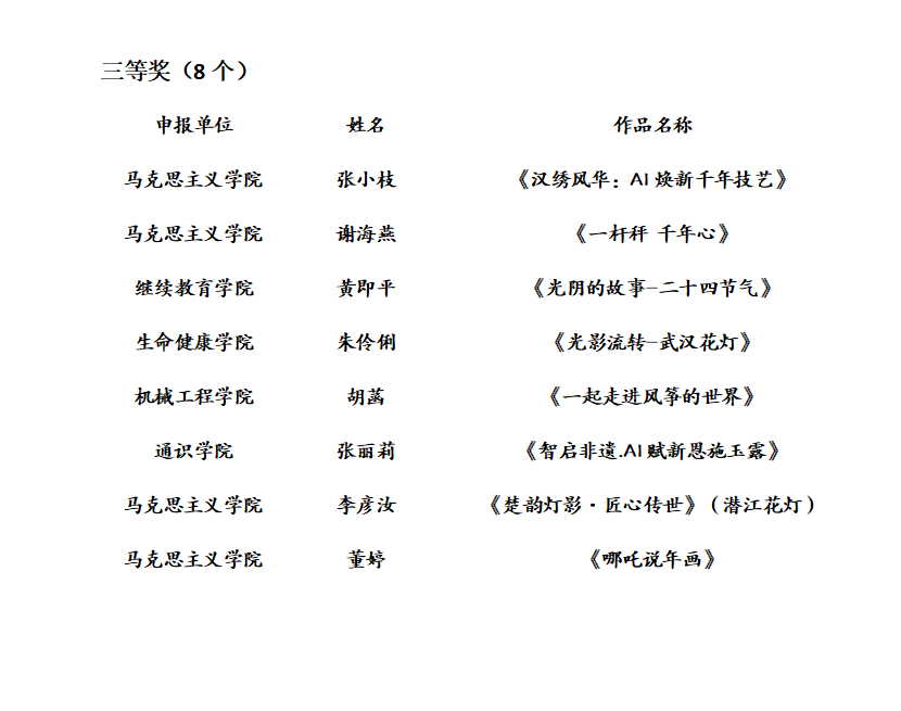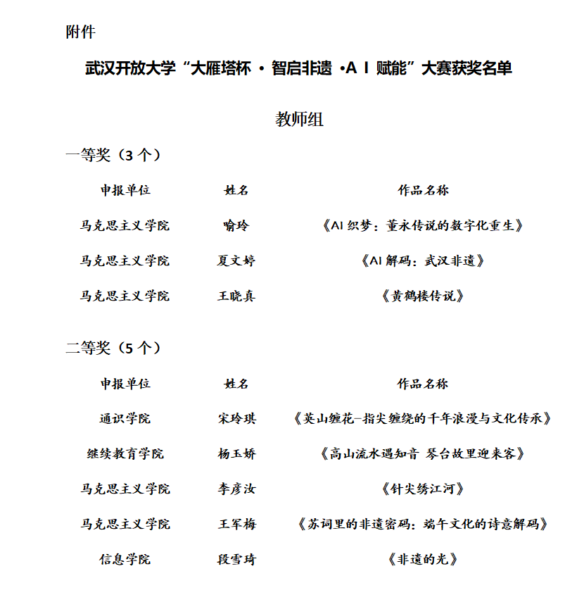 根据《关于举办武汉开放大学“大雁塔杯·智启非遗·AI赋能”大赛的通知》文件要求,经个人自愿申报、各单位推荐、专家评审,现对拟获奖名单予以公示(具体名单见附件),公示期2025年4月1日-2025年4月5日。