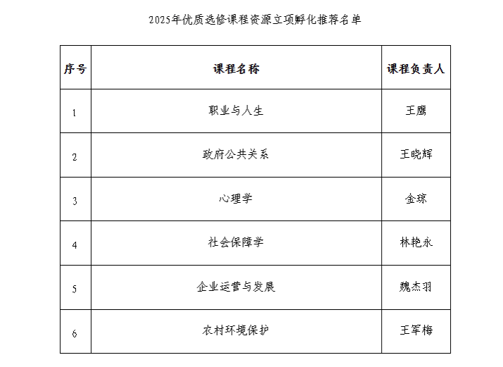 根据《关于开展2025年优质选修课程资源立项孵化及“金课”建设项目申报工作的通知》要求,经课程团队申报、学院(部门)审核推荐、专家评审,拟向国开推荐6门课程(名单见附件),现予以公示,公示期为2025年9月22日至9月24日。