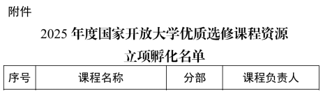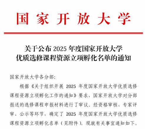 2025年度国家开放大学优质选修课程资源立项孵化项目遴选结果于近期正式揭晓。本次遴选严格依据《关于组织开展2025年度国家开放大学优质选修课程资源立项孵化工作的通知》要求推进,历经资格审核、专家评审、结果公示等多轮严谨遴选,最终确定立项孵化名单。武汉开放大学申报的《职业与人生》《政府公共关系》两门课程成功入选,这一成果标志着我校开放教育课程资源品牌化、精品化建设成效,已获得国家开放大学体系的高度认可。